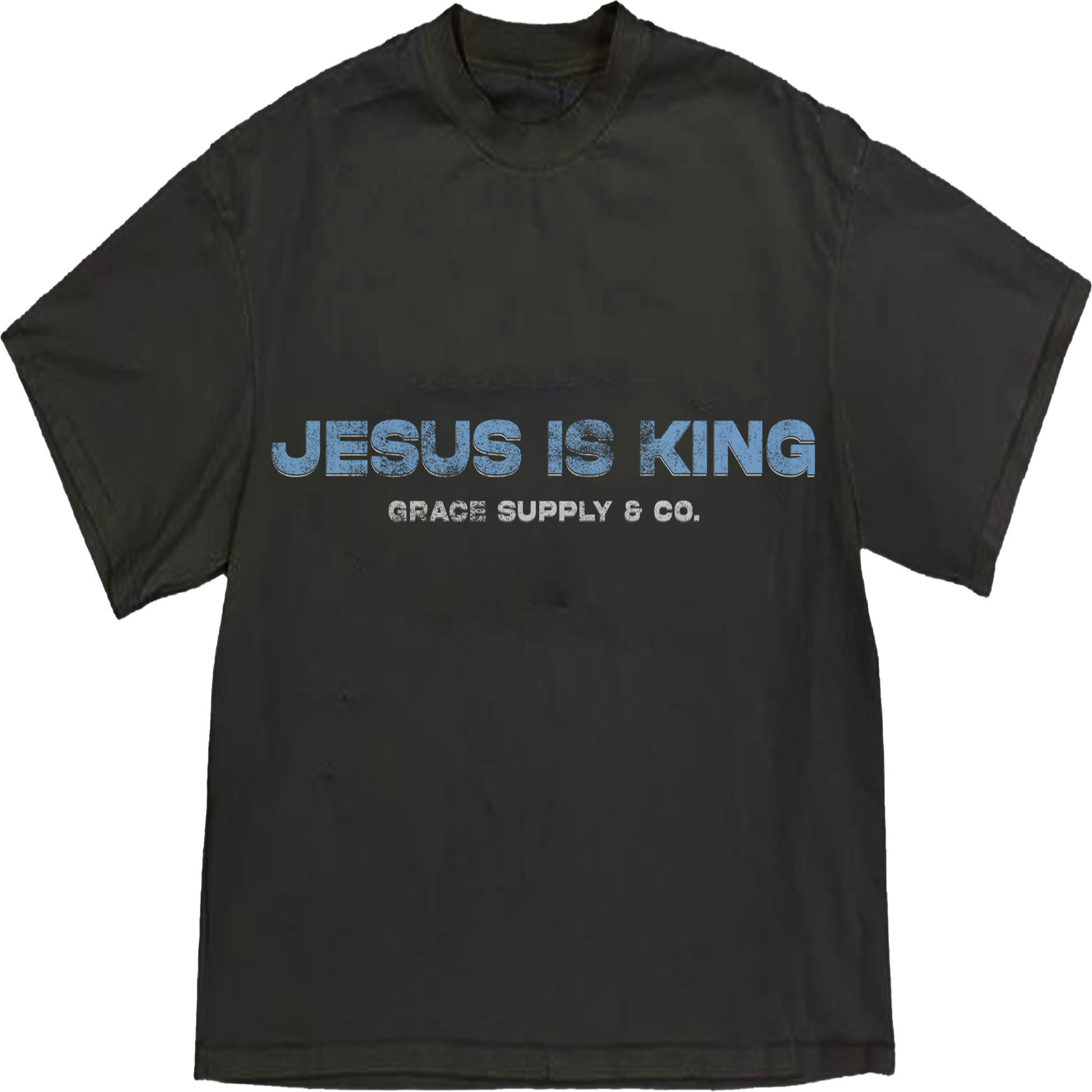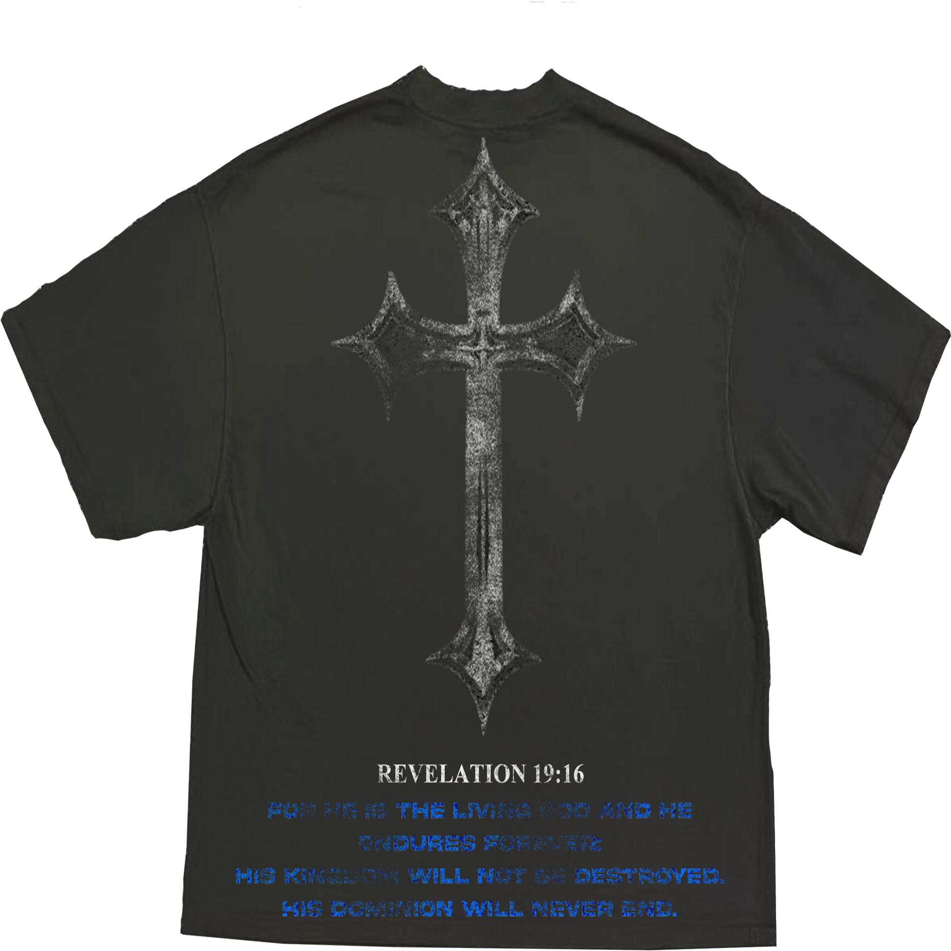 The front features bold, distressed blue JESUS IS KING lettering. The back showcases a detailed vintage-style cross graphic and Revelation 19:16 verse, and adding a powerful statement of faith message "FOR HE IS THE LIVING GOD AND HE ENDURES FOREVER. HIS KINGDOM WILL NOT BE DESTROYED . HIS DOMINION WILL NEVER END."